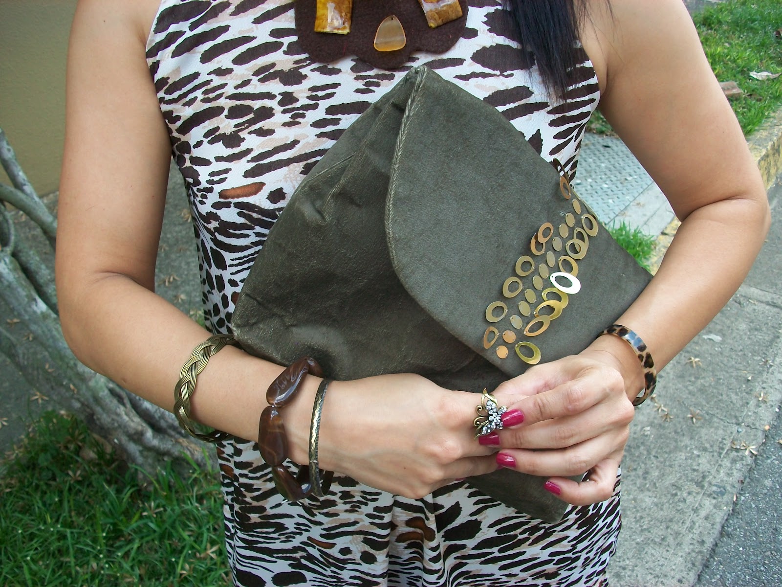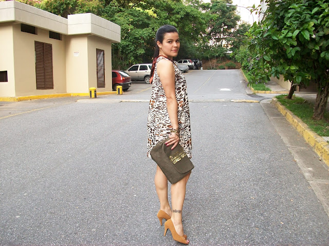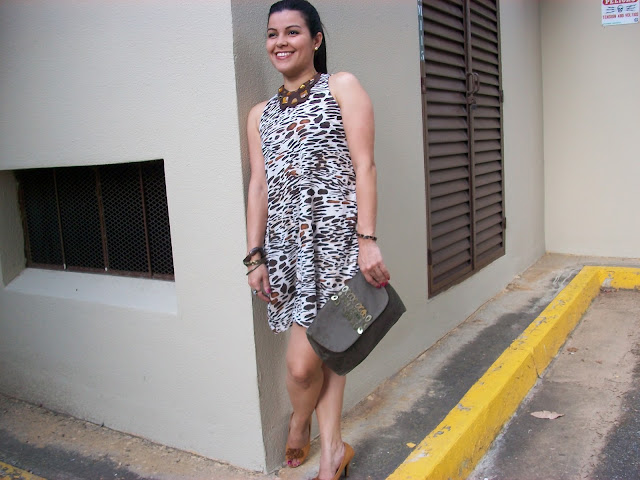 Hola, ya estamos en la mitad de la semana y acá sigue el sol como para seguir usando ropa fresca; mi delirio son las faldas y vestidos, la verdad las mujeres debemos conectarnos un poco mas con nuestra femineidad ese lado coqueto que nos hace sentir orgullosas de ser mujer, de sentirnos hermosas. Estamos muy acostumbradas a ponernos un jeans y flats y así lo hacemos casi a diario ( no digo que esté mal, solo que no abusemos) Usar vestidos no tiene por que ser incómodo ni formal, en el mercado a miles de diseños que van desde estilo callejero a algo formal, así que anímense y usen un vestido aunque sea una vez a la semana, verán que ese día sonreirán mas! Yo ando muy de vestidos y hoy no fue la excepción, me he puesto este de mi estampa favorita, el animal; no se que les parece pero a mi me gusta cada día mas, tengo muchas piezas de este diseño (no las uso todas juntas, ok) y es que bien usado luce muy bien, combiné con zapatos camel y un clutch verde militar para mantener la uniformidad en los colores, y un collar minibabero hecho en los mismos tonos. Bueno espero que les guste e intenten usar vestidos mas a menudo.